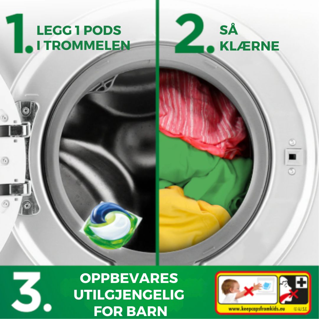 Plassering: Legg 1 POD direkte bakerst eller i bunnen av tom trommel før tøyet legges i. Ikke legg POD i vaskemiddelskuffen.
