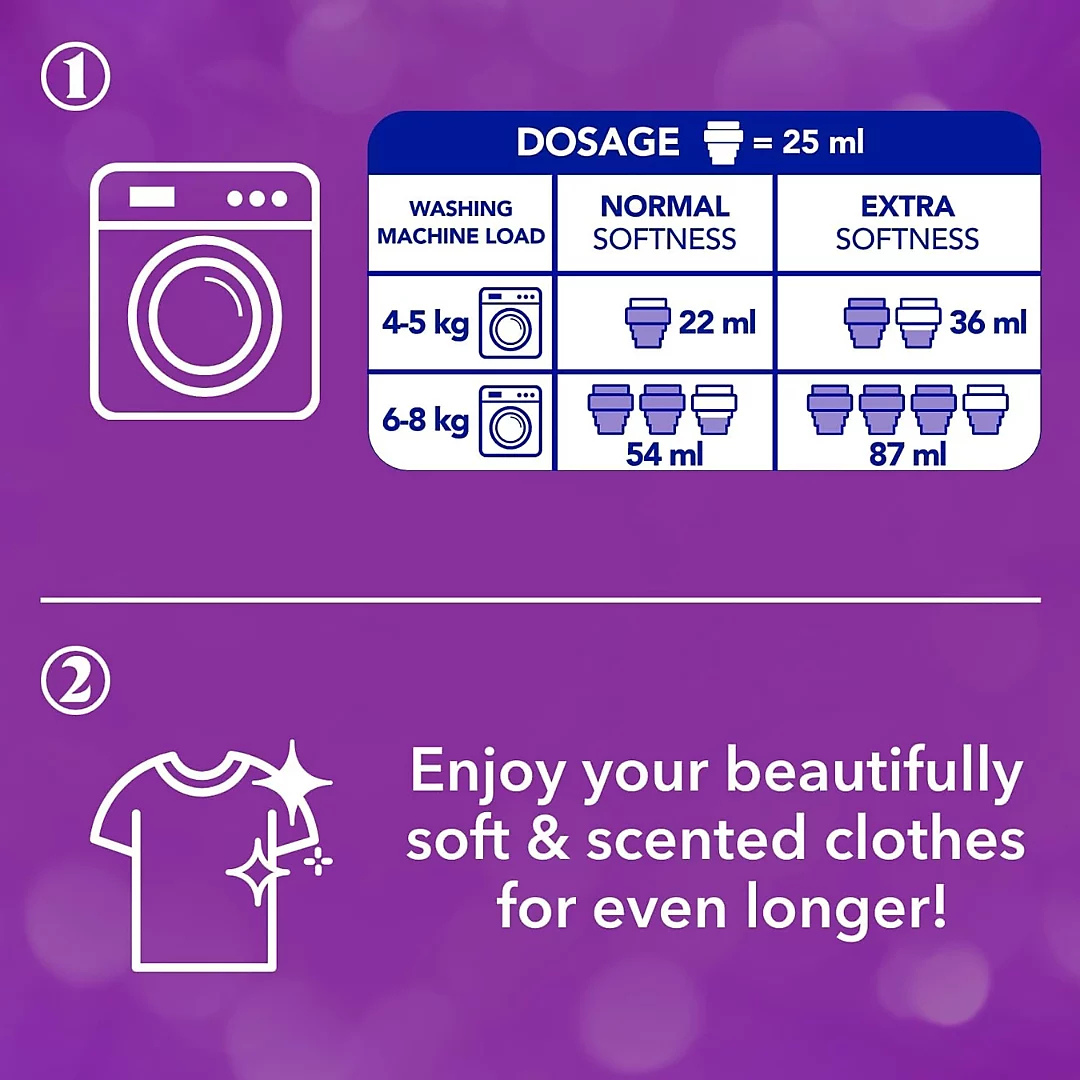 Tilsett tøymykneren i skyllemiddelkammeret i vaskemaskinen. Dosering: 4–5 kg vask: 22 ml (normal mykhet) eller 36 ml (ekstra mykhet). 6–8 kg vask: 54 ml (normal mykhet) eller 87 ml (ekstra mykhet). Må ikke helles direkte på tekstiler.
