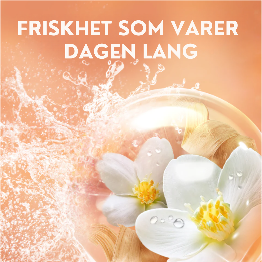 Opplev en harmonisk balanse av friskhet og eleganse med Bold All-in-1 Pods Jasmine & White Cedar. Denne duften kombinerer den beroligende aromaen av jasminblomster med den varme, treaktige tonen av hvit seder, for en vask som både føles luksuriøs og naturlig frisk. De smarte vaskekapslene fra Bold har innebygd flekkfjerner og Lenor-tøymykner som gir klærne dine en myk og behagelig følelse. Formelen er effektiv mot både lukt og vanskelige flekker, samtidig som den beskytter tekstilene og gir en langvarig duft som varer gjennom dagen.