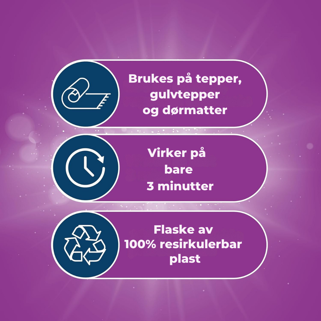 • Fjerner vanskelige flekker fra tepper og møbelstoff