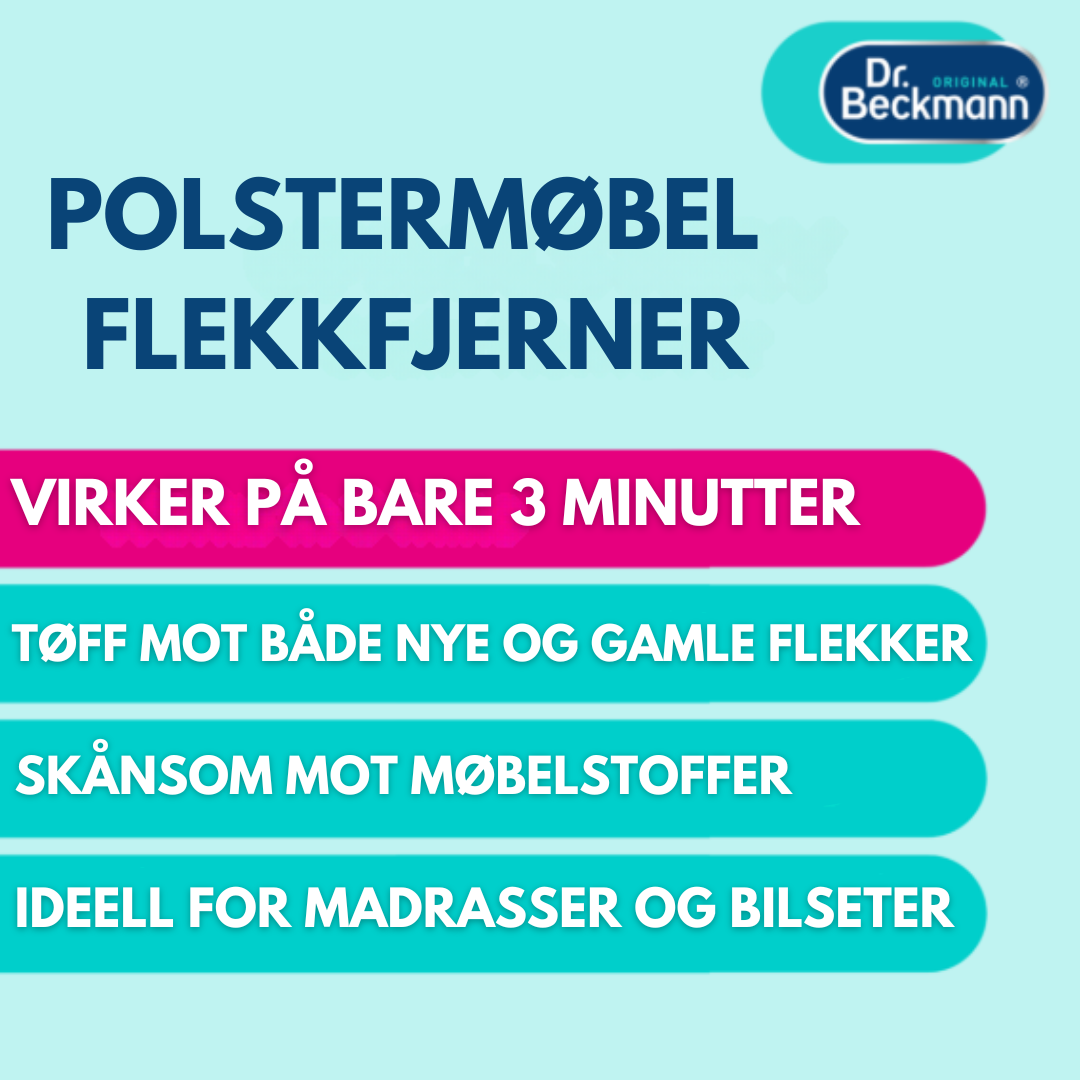 Dr. Beckmann Upholstery Stain Remover er en effektiv løsning for rask og grundig fjerning av vanskelige flekker på møbler, bilseter, madrasser og andre tekstiler. Den avanserte formelen med Oxi Power og Freshplex®-teknologi fjerner både flekker og lukt, og etterlater tekstilene hygienisk rene og friske.