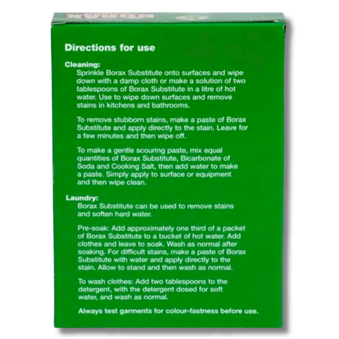 Borax Substitute er luktfritt, biologisk nedbrytbart og produsert i Storbritannia som en del av Dri-Paks Clean & Natural-serie med ikke-giftige rengjøringsprodukter.