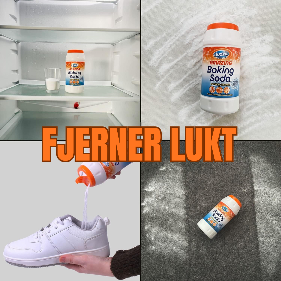 Sett en åpen boks med Duzzit Baking Soda i kjøleskapet, søppelbøtten eller andre områder for å absorbere lukt. Kan også strøs på tepper og støvsuges etter noen timer.