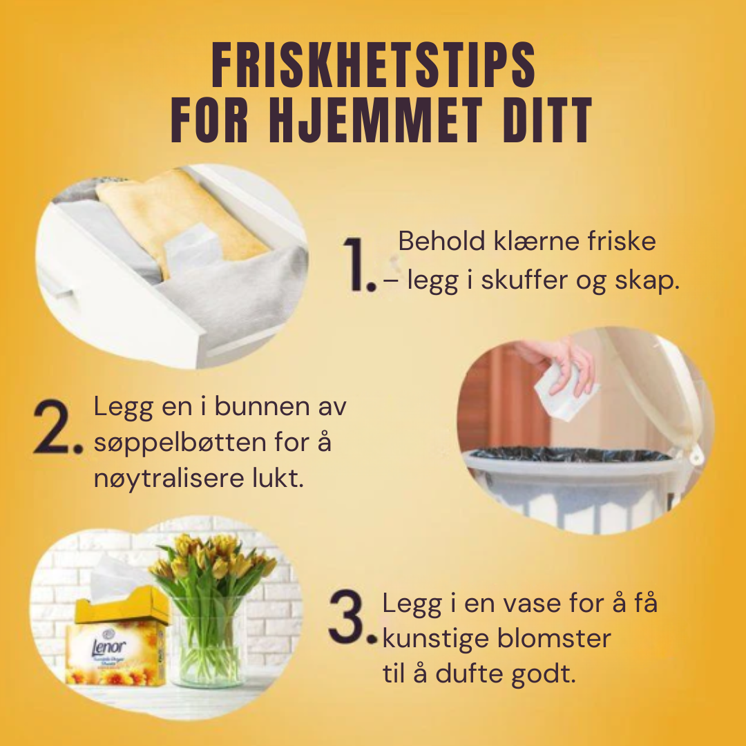 Gi klærne dine langvarig friskhet og mykhet med Lenor Tørketrommelark Summer Breeze. Disse arkene er laget for å gi klærne en behagelig, sommerlig duft samtidig som de reduserer statisk elektrisitet og krøller under tørking.