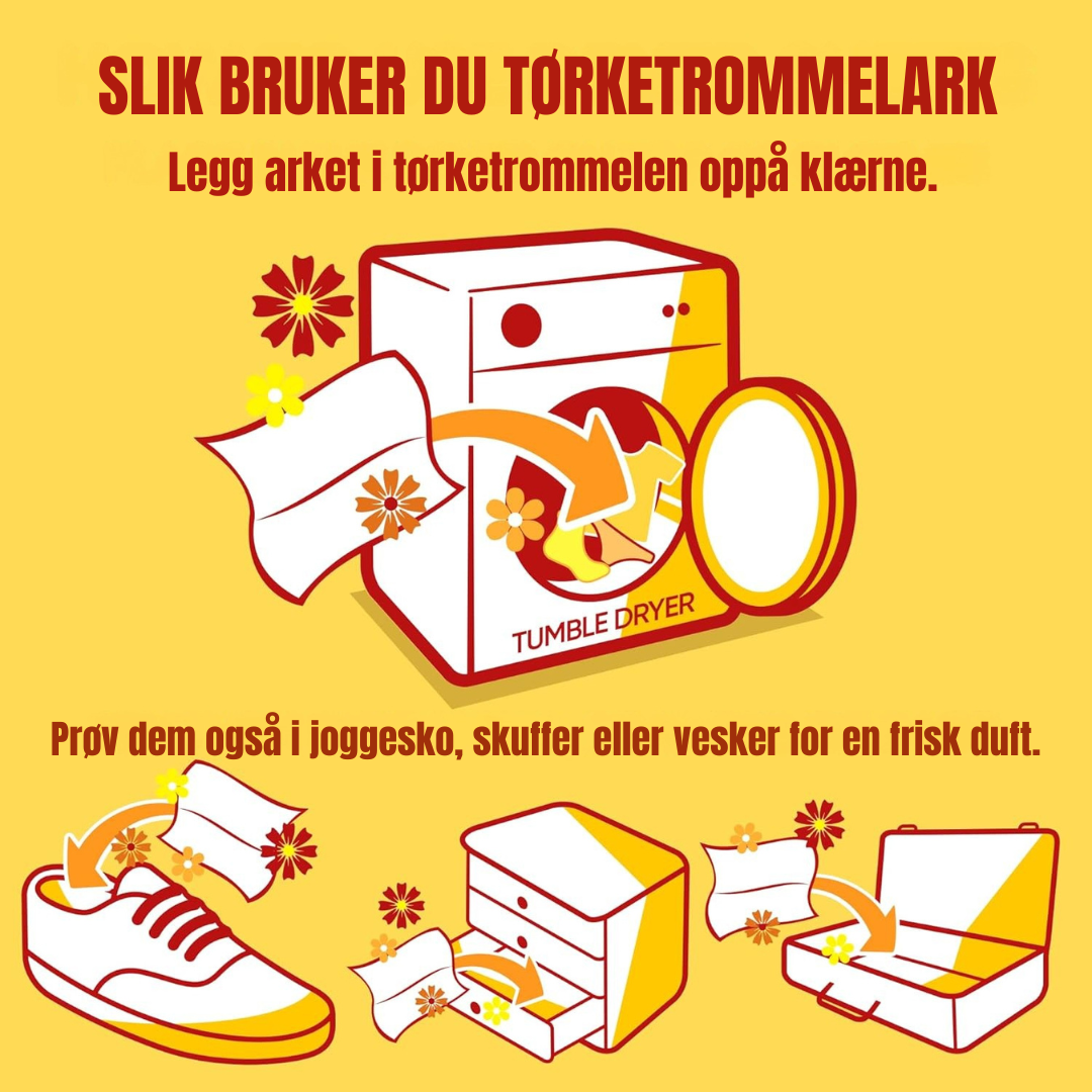 Legg klærne i tørketrommelen som vanlig. Plasser ett ark oppå tøyet før du starter programmet. For store vasker eller ekstra duft, bruk to ark. Kast arket etter bruk.