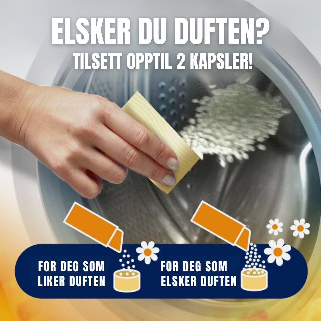 Ikke bruk i tørketrommel, og ikke hell perlene i tøymykner- eller vaskemiddelbeholderen.