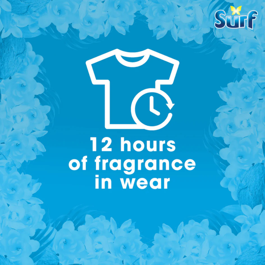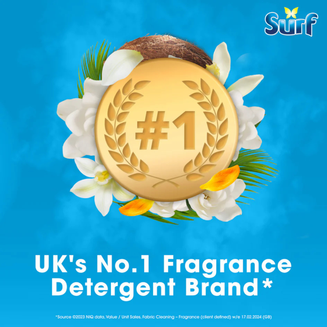 Surf Coconut Bliss er et konsentrert flytende vaskemiddel som gir effektiv rengjøring kombinert med en rik og glad duftopplevelse. Den tropiske duften av kokos og monoi-blomster, avrundet med kremet vanilje, gir klærne en langvarig og behagelig friskhet. Formelen inneholder naturlige eteriske oljer og er utviklet for å gi strålende rene klær med duft som varer i opptil 12 timer i bruk.