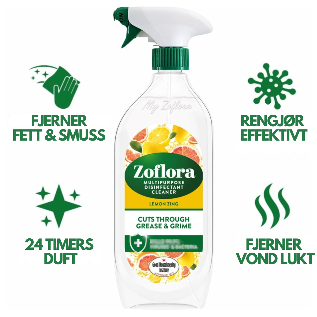 Zoflora Lemon Zing er en kraftig og klar til bruk flerbruksspray som effektivt fjerner fett, såperester og smuss fra harde overflater. Den frisker opp hjemmet med en oppløftende duft av sitron, grapefrukt og ingefær, og etterlater en ren og glansfull overflate.